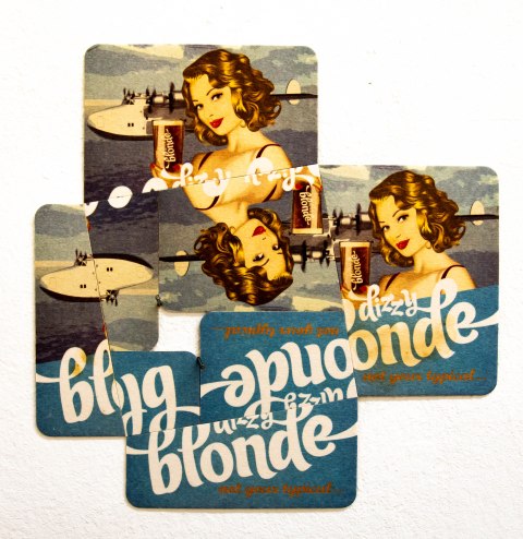 Zunächst erkennt man jedoch kaum Bierdeckel, sondern die vielen Objekte erzeugen insgesamt ein Muster oder Geflecht. Die schiere Menge verschiebt die Wahrnehmung vom einzelnen Gebilde auf das serielle Prinzip. Doch immer wieder schweift der Blick von der Gesamtkomposition ab zu ihren einzelnen Bestandteilen – jeweils einige gleiche Untersetzer wurden durch Schnitte, Anordnungen und Verschiebungen spielerisch neu zusammengesetzt. Mal verfremden sie die erkennbaren Ausgangsbilder, mal verschwindet die ursprüngliche Wirkung. Meist sind die Logos und Motive kaum noch erkennbar.