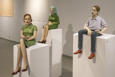 Gleich zu Beginn begegnen uns übergroße Köpfe der Bildhauerin auf hohen Sockeln, später auch lebensgroße Frauenbüsten. Alle Gesichter wirken entspannt, mal in sich gekehrt, mal herausfordernd – aber immer ohne dramatischen Ausdruck. Auch viele in der Ausstellung verteilte, vollständig modellierte Figuren sitzen meist recht zurückhaltend auf Sockeln zusammen und ruhen in sich. Sie sind leicht verkleinert modelliert, Körper und Antlitze vermitteln dieselbe Haltung. Manche sind leicht einander zugewandt, andere wirken völlig versunken und scheinen sich selbst zu genügen. Alle halten inne und sind still…