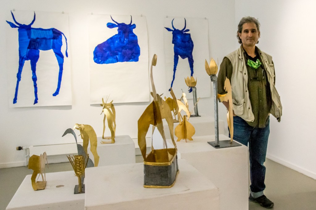Abi Shek füllt die große Halle mit blauen Tuschezeichnungen und Holzdrucken von Stieren, Hirschen oder Straußen auf riesigen Leinwänden. Manche dieser Bilder in „Geschöpfe und Zeichen“ erinnern an vergrößerte, ins Licht gelangte Höhlenzeichnungen. Es geht dem Künstler nicht um die präzise Wiedergabe der Tiere, sondern er reduziert sie auf ihre reine Form – auf ihr Wesen. Auch in kleinen, golden wirkenden Blechobjekten sind die Tiere stark auf das Wesentliche reduziert.