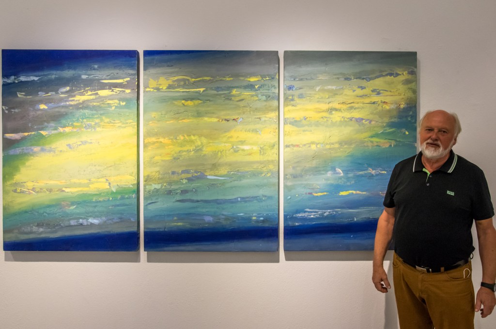 Günter Liebaus Arbeiten in der Schau „Strukturen“ hält man zunächst für abstrakte Kompositionen und erträumte Landschaften, die keine erkennbaren Orte zeigen. Doch bei näherer Betrachtung, wirken die farbkräftigen Bilder vor allem durch ihre starken Oberflächen-Strukturen. Die schafft der Künstler durch übereinander aufgetragene, aufreißende Spachtelmassen, die er zwischendurch anschleift. Daher mischen sich Spuren der vorigen Gestaltungen mit weiteren Aufbrüchen und Rissen, auf die Liebau erneut reagiert. Seine nichts darstellenden Werke lösen beim Betrachter Emotionen und Fantasien aus, für die seine Titel Fährten legen: „Lichtspiele“ oder „Zwischen Moll und Dur“.
