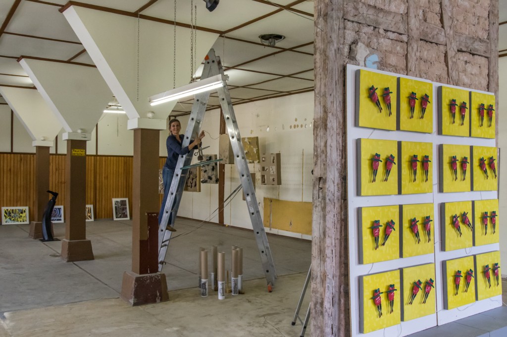Der Kunstraum weist kräftige Spuren seiner Nutzung auf, doch viele Kreative lieben die Herausforderung, gegen den Verfall zu arbeiten. So auch Britta Schäfer-Clarke (Birstein) und Matthias Kraus (Hasselroth), deren Werke dadurch quasi mit der Firmengeschichte korrespondieren. Beim Besuch ist die Schau noch nicht vollständig aufgebaut. Schäfer-Clarke befestigt gerade ein geschichtsträchtiges Mobile, das auf bewegte Frauen in der Waechtersbacher Historie verweist: sowohl auf die vielen Arbeiterinnen als auf die wenigen Gestalterinnen. Im Hintergrund hängen ihre riesigen Holzschnitte von Tänzerinnen und in großen schwebenden Schachteln tummeln sich kleine Ballerinen als anmutige Wachsfiguren oder plumpe Stoffgestalten. „Tanz im Karton“ nennt sie die Installation (anstatt „Ruhe im Karton“) , die auf das klassische Ballett verweist: Das fordert zwar reichlich Bewegung, presst die Tänzerinnen aber in ein enges Formkorsett.