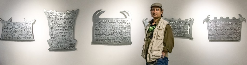 Im Rahmen der Herbstausstellung der Kunststation präsentiert Abi Shek in seiner Schau „Geschöpfe und Zeichen“ auch blecherne Schilder mit eigenartigen Schriftzeichen.