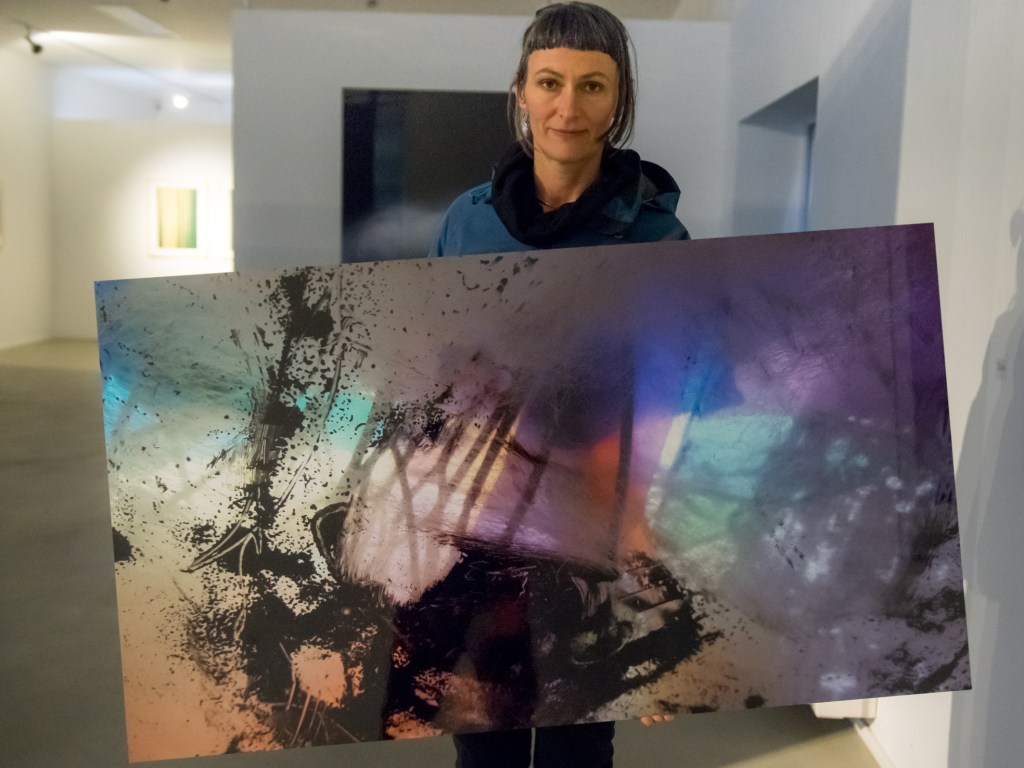 „Christine Mann zeigt ihre Arbeit „Hinaus“, die auf dem Leuchttisch entstand“