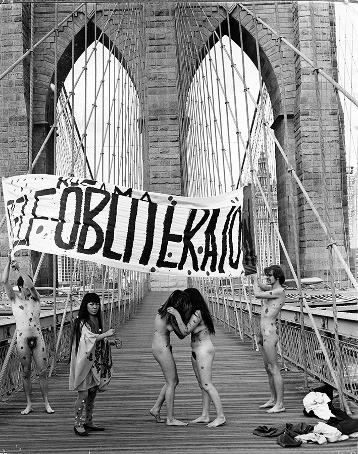 Aber nun kommen wir auch zu ihren abenteuerlichen Happenings, mit denen Kusama in den 1960er-Jahren weltweit bekannt wurde. Während sie ihre Werke in renommierten US-amerikanischen und westeuropäischen Galerien und Museen präsentierte, ging sie mit Ney Yorker Hippies auf die Straße. Dort verstörte sie die Bürger durch radikale Aktionen, in denen sie zur Nacktheit, freier Liebe und den Kampf gegen den Krieg aufrief: „Zieh dich aus, Nacktsein kostet nichts!“ In „Selbstauslöschungsperformances“ bemalte sie – später auch in Europa – nackte Menschen mit Polka Dots. Aber sie war nicht (nur) die „Hippie Queen“, sondern mit ihren wohlkalkulierten Grenzgängen zwischen Rebellion und Kunst, geißelte sie die erbärmliche gesellschaftliche Rolle der Frauen und die Schwulenfeindlichkeit jener Zeit sowie die beginnende Kommerzialisierung des Kunstbetriebs.