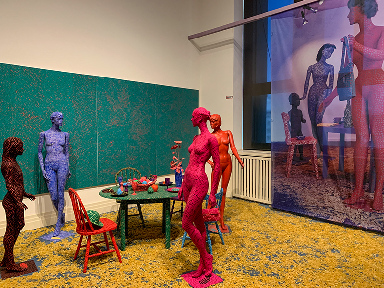 Wie diese beiden Kunstwerke sind insgesamt acht Räume im Gropius-Bau Nachbauten von Kusamas Environments der Jahre 1952 bis 1983. Neben buntgetüpfelten Schaufensterpuppen oder einem Boot voller Gipsphalli hängen riesige verblasste Erinnerungsbilder an diese Inszenierungen. Ihre Gestaltungen mit Polka Dots (engl. Punktmuster) auf vielen Objekten ziehen sich durch die Ausstellung. Bereits vor zwei Jahren war hier im „Garten der Lüste“ ein gewaltiger, begehbarer Kunststoffgarten der Künstlerin aus weißem Plastik mit farbigen Tupfen zu erleben.