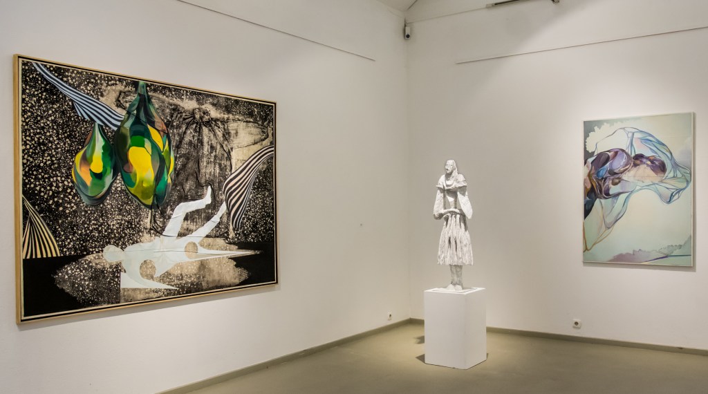 Die heute vorgestellte Arbeit mit dem Titel „Wimpernschlag der Endlichkeit“ ist eine Collage. Das Hemd, das der gefalteten Leinwand hinzugefügt wurde, verschwindet durch die Übermalung im düsteren Hintergrund. Eine weißliche, transparente Figur liegt unten im Bild. Doch trotz der figurativen Gestaltung hat auch dieses rätselhafte Gemälde des Künstlers – wie alle Werke in seiner Ausstellung – etwas Unwirkliches. Kochs kreiert keine mimetischen Abbildungen, seine Objekte entwickeln ihre eigene Realität. Verstärkt wird dieser Eindruck noch durch die Faltungen, die oft am unteren Bildrand eine Art Bühne schaffen, auf der nur theatralische, keine realen Ereignisse angespielt werden.