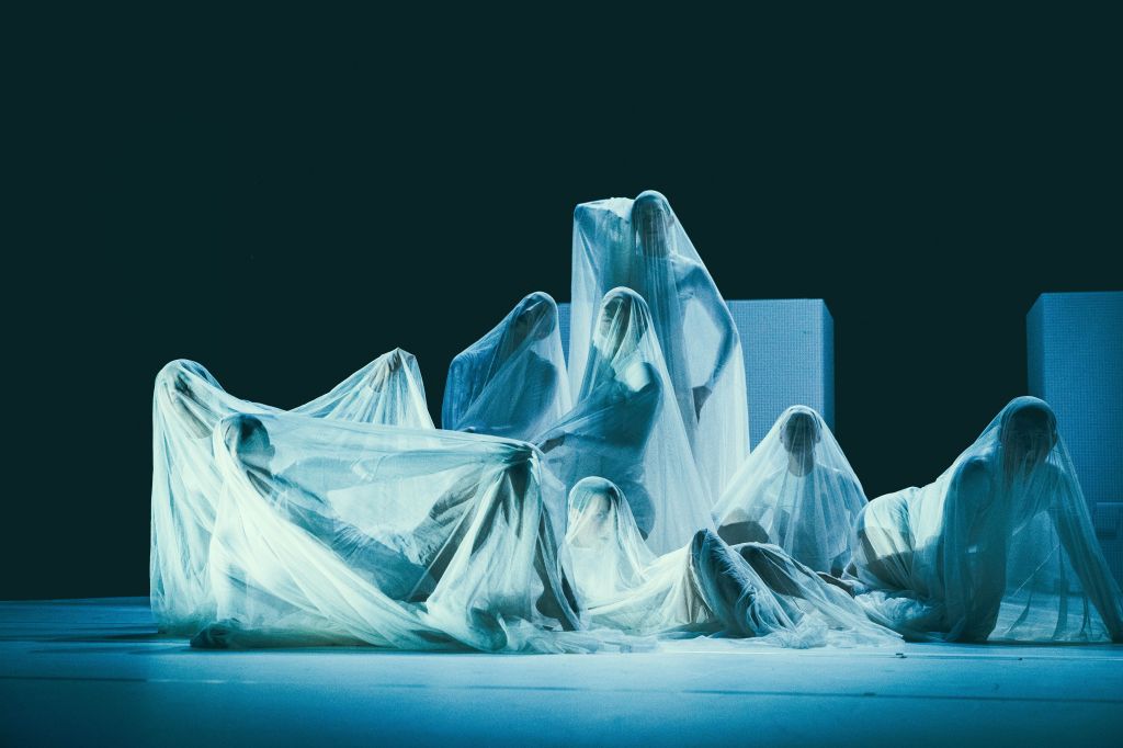 Auf der schneeweißen Bühne schlängelt sich eine schwarzglänzende Gestalt aus einem silbrigen Behältnis. Sie windet, verschlängelt, verbiegt sich. Stakst mit bizarren Bewegungen zu Industrial-Klängen umher. Zuletzt wird sie durch eine riesige, weiß gewandete Figur mit Baby, von der Rampe gezerrt. Mehr und mehr strahlendweiße Tanzende erscheinen und vollführen irrsinnige akrobatische Bewegungen. Sie wirken wie Gummimenschen mit starren Puppenaugen.