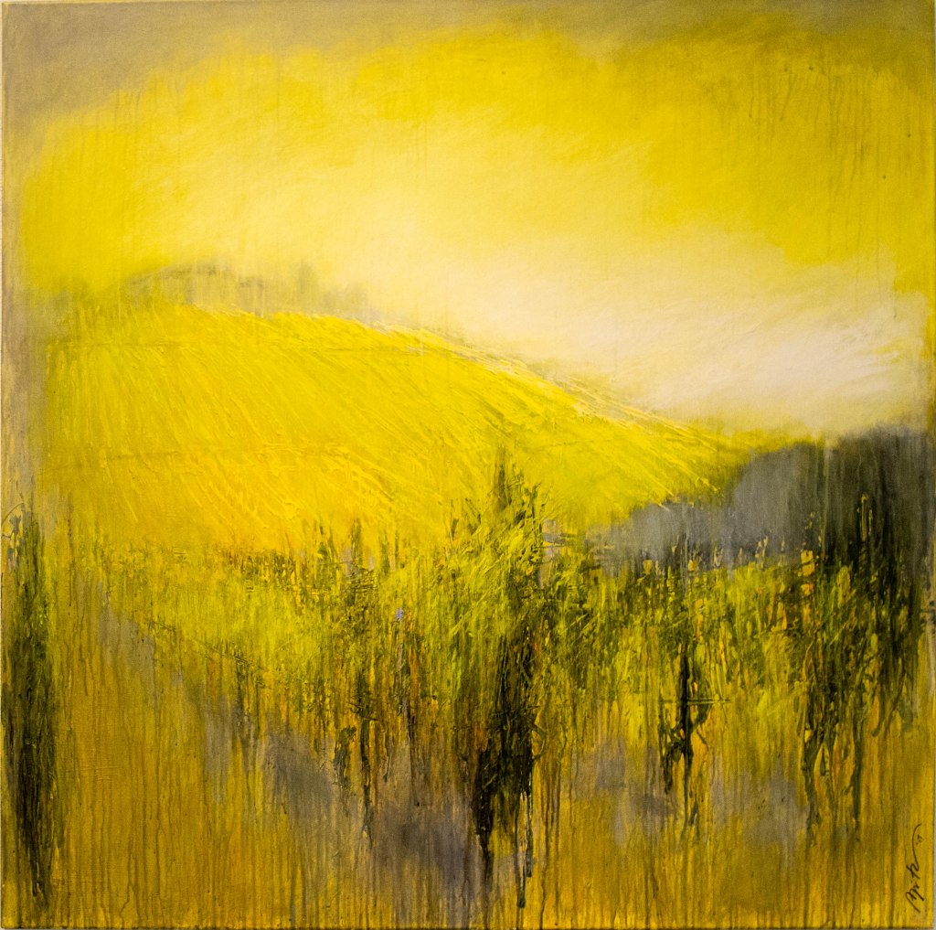 MICHAEL APITZ nennt seine Schau „Rhein trifft Rhön“, ins Auge fällt sofort die Milseburg-Trilogie. Das legendäre Bauwerk und seine Umgebung sind gerade noch erkennbar, jedoch in unwirklichen grünen, orangenen oder gelben Farben gehalten. Sein „Leinpfad“ wirkt wie eine dramatische Eruptionsmasse. Manche Gemälde, etwa der „Berg in Rot“ oder „Der Blick“, sind mit den dick aufgetragenen Farben so reduziert, dass sie nicht mehr gegenständlich wirken.
