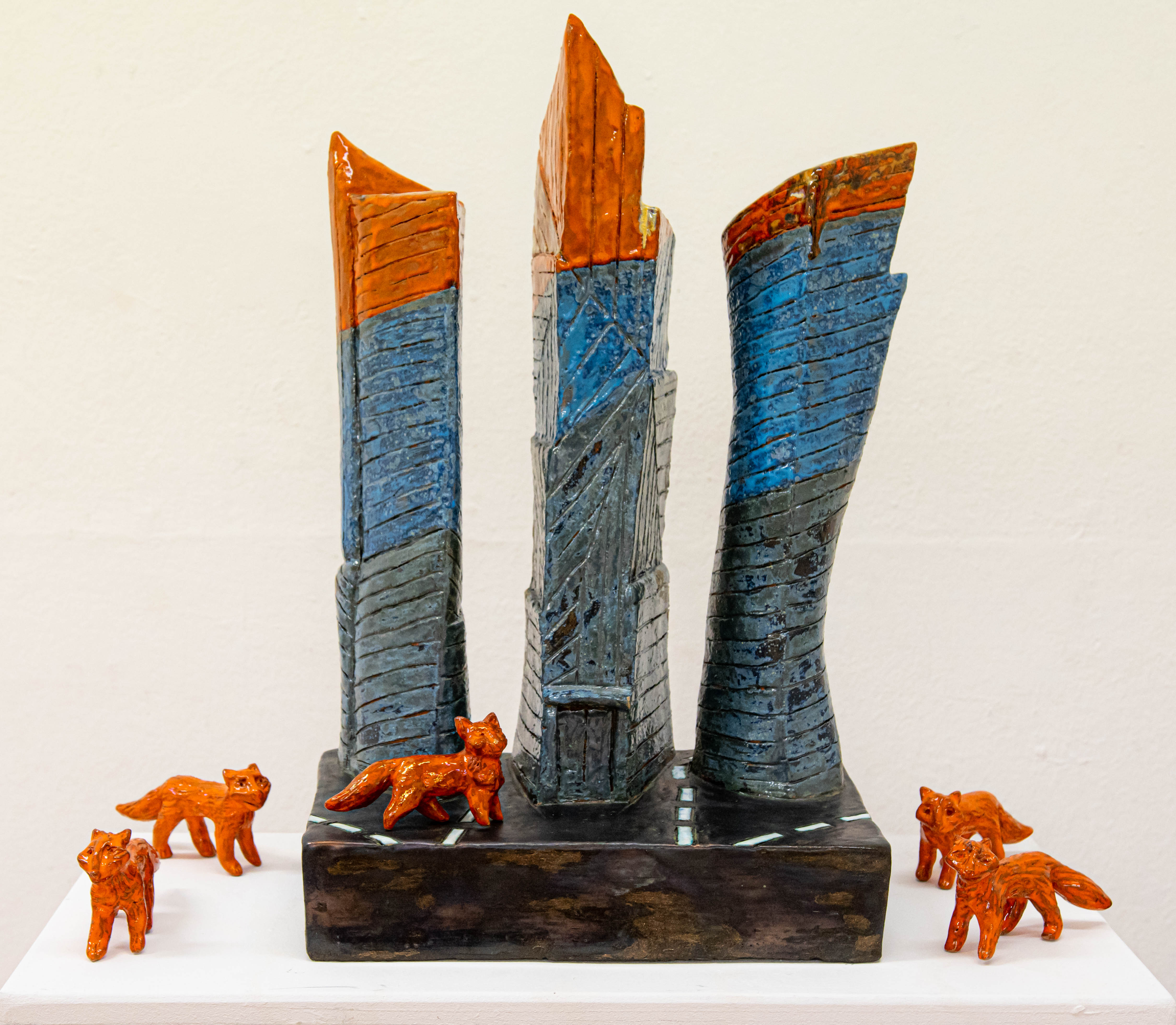 Im Studio wird es italienisch, bereits davor hat sich IDILIO GALEOTTI selbst lebensgroß als „Il Viggiatore“ (Titel) aufgebaut, als Figur eines Reisenden. In einem Video inszeniert er dessen fiktive Erlebnisse: Jahrzehntelang schlief er im Eis und wird nun mit den Unbilden der heutigen Welt konfrontiert. Diese Fantasien werden auch durch glasierte Keramikobjekte dargestellt: Mit einer sich drehenden Welt, Rotfüchsen die Berlin erobern oder fantastischen architektonischen Gebilden, in denen einsame Menschen agieren.