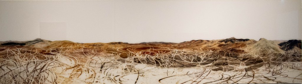 Im großen Saal, quasi zwischen den Landschaften, zeigt CAROLINA CAMILLA KREUSCH ihre „Makrowolke und Mikroloses“ (Titel). Farbenfrohe abstrakte Gebilde wirken an den Wänden wie Halbreliefs – oder Fenster, durch die man in andere fremde Welten schaut. Es sind aber flache Bilder, die dynamisch und – irgendwie – musikalisch anmuten, wahrscheinlich könnte man sie mit Saxophonklängen fantastisch paraphrasieren.