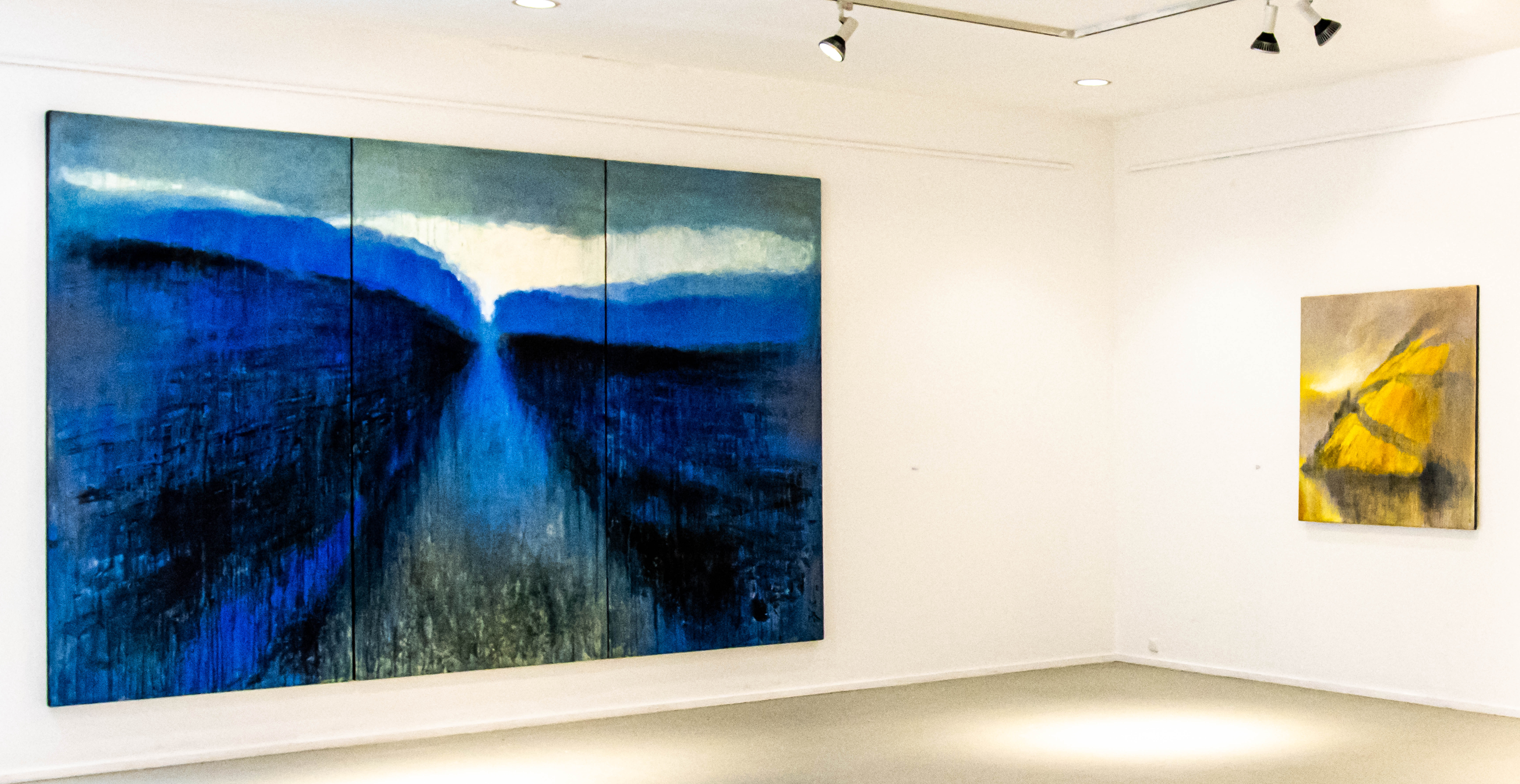 Sie drücken, nach langen Streifzügen durch die Natur im Rheintal oder den Hügeln der Rhön, seine intensiven Emotionen aus, die wir durch die Bilder nachempfinden können. Im kleinen Saal nimmt das riesige, blau-schwarze Gemälde „Der Weg“ eine ganze Wand ein (siehe Foto). Es mutet düster und dramatisch an. An der angrenzenden rechten Eckwand hängt die wesentlich kleinere, strahlend gelb-goldene Komposition „Johannisberg“, welches dem dunklen „Weg“ die Schwere nimmt. Im großen Saal sind neben drei wirklich knalligen Werken mit satten roten Farben, auf der Eckwand beschwichtigende dunkle Bilder befestigt. Durch diese, von Dr. Elisabeth Heil durchgehend bewusst kuratierten Kontraste, entsteht immer wieder Spannung und dennoch Ausgleich in der Ausstellung des Künstlers. Die Kuratorin meinte übrigens beim Rundgang, die „strahlend warmen Farben“ seien hilfreich für die kommenden tristen Wintertage.