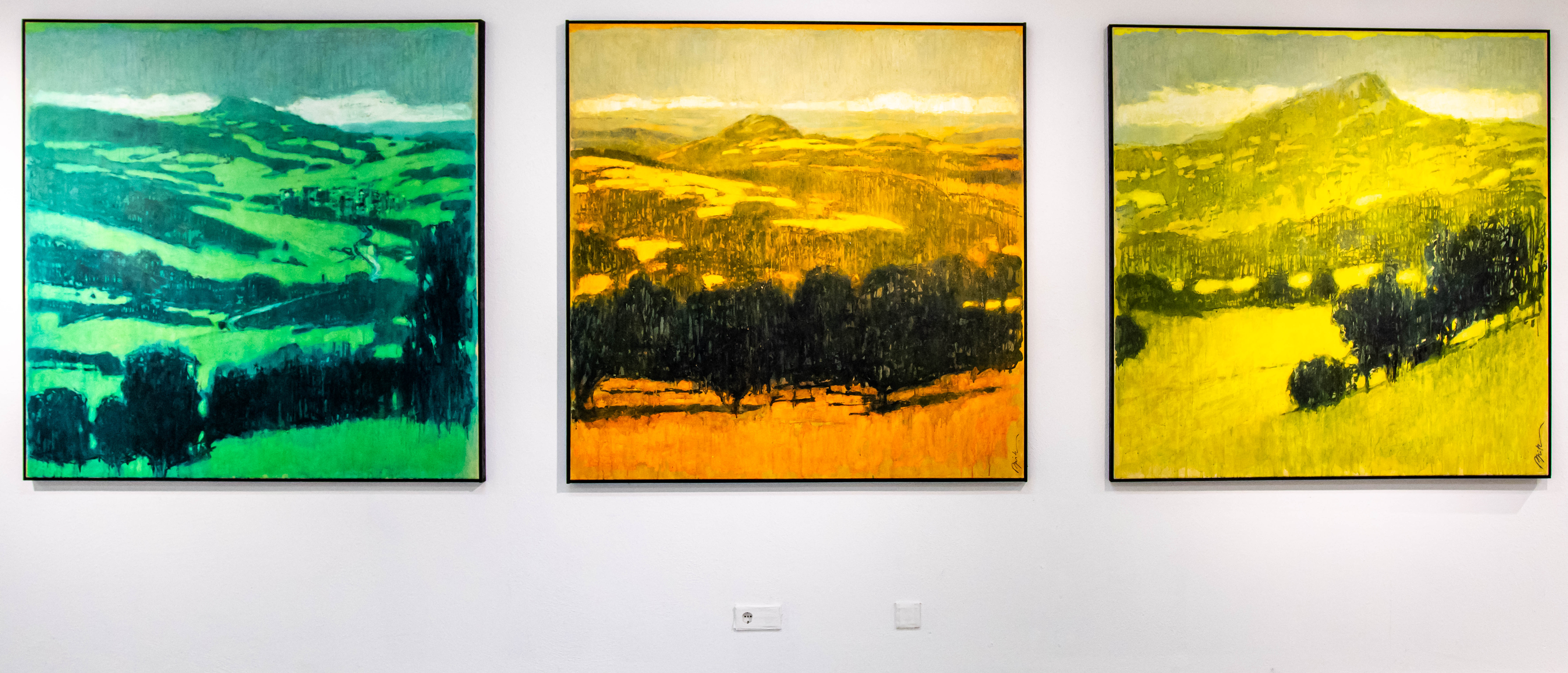 In den letzten zwei Jahren schuf Apitz neben der spektakulären, aber halbwegs wiedererkennbaren „Milseburg-Trilogie“ mit irrealen Farben (Foto ganz unten), auch weitere Rhönbilder, die jedoch kaum etwas von den zum Malen anregenden Orten verraten: „Der Berg“, „Die Weite“, „Die Kuppe“ oder „Das Tal“ sind universelle, expressionistisch wirkende Landschaften.