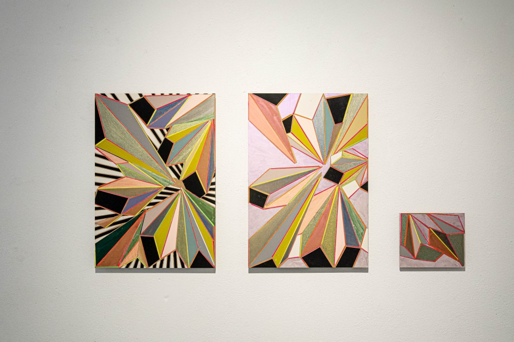 Ihr Werk im Hintergrund des Fotos sieht aus wie ein leicht dreidimensionales Objekt, ein „Halbrelief“, weitere solche Arbeiten brachte sie mit nach Kleinsassen. Doch die vermeintlichen Wandskulpturen sind ausgesägte Platten aus dem sehr festen MDF-Holz. Diese gestaltete sie dann sorgfältig weiter mit kräftigen Farben, „die ich wie Baumaterial verwende.“ Dadurch erzielt sie die räumliche Wirkung.