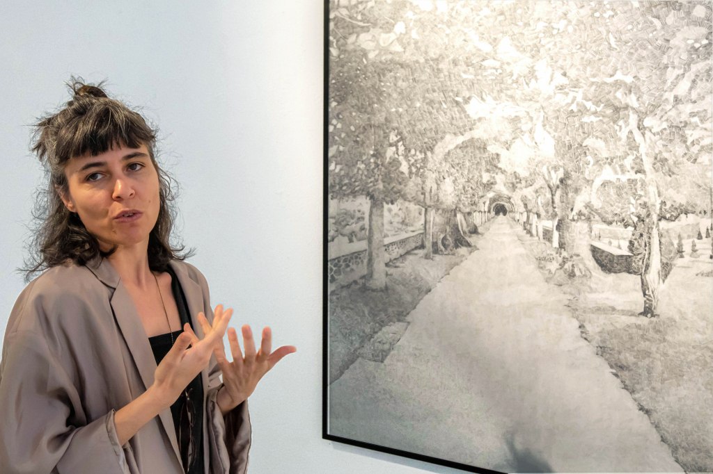 Außerdem zeigt sie hervorragende Bleistiftzeichnungen auf großen Bögen. Zwei davon sollten Momente aus dem barocken Garten von Schloss Hundisburg (Sachsen-Anhalt) mit Gedichten aus Fuchs‘ einjährigem Israel-Aufenthalt verbinden. Aber die Künstlerin veränderte die Bilder, machte die poetischen Zeilen unsichtbar – erkennbar, aber nicht mehr lesbar. Darüber schrieb sie jedoch: „Unsere Herzen sind groß genug, um all das zu fühlen“