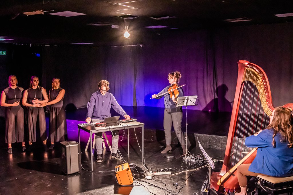 Im Saal ist es lange dunkel. Plötzlich beleuchtet rötlich-lila Licht die Bühne. Zwei Musikerinnen, ein Musiker, drei Tänzerinnen erscheinen. Erst setzt die Harfe ein, dann die Bratsche und schließlich das elektronische Gerät, mit sanften, aber bizarren Tönen. Bald bewegen sich auch die Tänzerinnen ganz zart, nicht im Rhythmus, eher parallel zu den Klängen. Gemeinsam kreieren alle eine traumartige Atmosphäre. Bald werden die Darbietungen wilder, dramatischer – und enden abrupt. Erst dann werden die drei aus Leipzig angereisten vorgestellt: Harfenistin Babett Niclass, Bratschistin Neasa Ni Bhrian und der -Elektroniker Damian Ibn Salem. Mit den drei Tänzerinnen Meline Gottwald, Julie und Maren Opsahl trafen sie mittags erstmalig aufeinander und improvisierten gemeinsam.