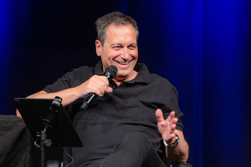 Sofort legt der Satiriker mit Donald Trump los, der aktuell in einem Bild als Papst posiert. „Dass der sich damit zufriedengibt, nur Stellvertreter Gottes zu sein“, meint er nachdenklich. „Aber ich respektiere ihn…als Kollegen. Putin lacht sich tot über ihn.“ Immer wieder will der Kabarettist mit dem Programm beginnen, aber ständig fällt ihm Neues ein: „Trumps ökonomischer Sachverstand ist so minimal, da könnte man sogar den Habeck als Berater schicken.“