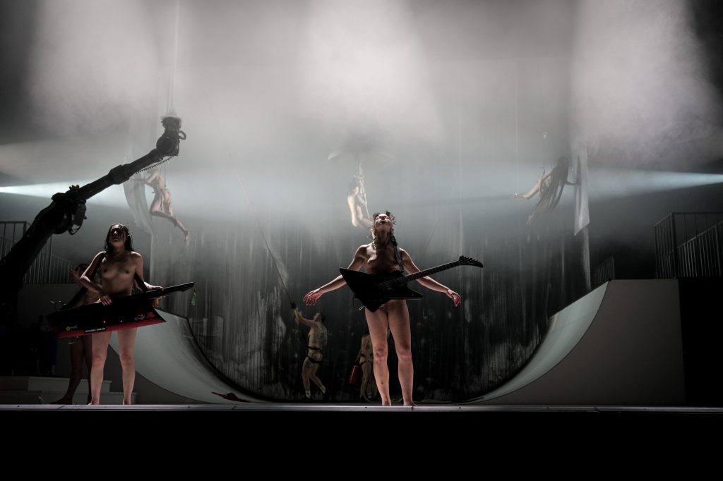 Ein riesiges rotleuchtendes Kreuz kracht auf die Bühne. Darauf kopuliert jetzt das nackte Paar. Susanna reißt sich die Kleider vom Leib. „Ich darf Euch nun die Schwestern meines Ordens vorstellen“, verkündet sie. Bevor sie sich völlig entkleiden, agieren etliche Tänzerinnen mit Reststücken ihrer Nonnenroben. Die Hindemithklänge gehen in Rockmusik über. Ohrenbetäubendes Geschrei. Irrsinnige E-Gitarrenriffs einer Rollschuhfahrerin. Andere rasen mit ihren Rollerblades in der Half Pipe auf der Bühne. Eine riesige Glocke senkt sich herab, eine Tänzerin wird zum Klöppel und läutet die Ektase ein.