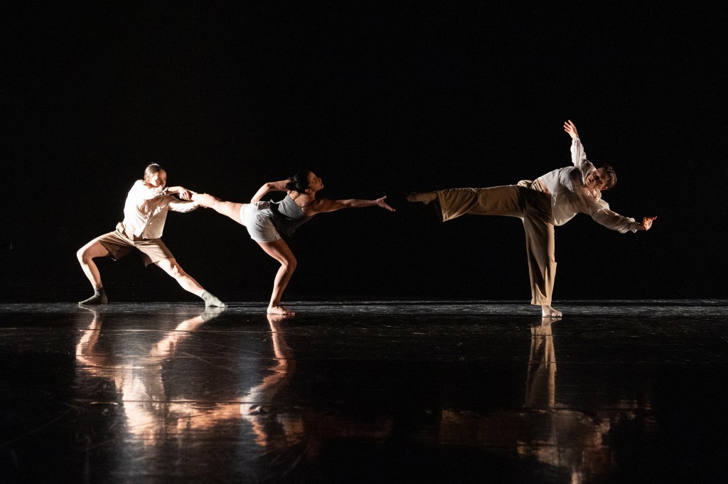 Das Programm beginnt mit einer kleinen Etüde aus „The Second Detail“ von William Forsythe, also einem Klassiker aus der Erneuerung des Balletts in den frühen 1990er-Jahren. Zwei, drei Ballettfiguren werden zitiert, dann drehen, gleiten, flattern die Tanzenden mit immer bizarreren Bewegungen in sämtliche Richtungen auf der Bühne. Frieren flüchtig ein. Formieren sich neu. Tanzen weiter. So zeigen sie eine kleine Hommage an die Zeiten des Umbruchs.