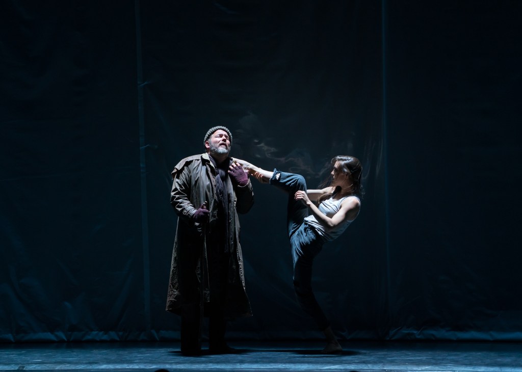 Neun Gestalten liegen vor dem geschlossenen Bühnenvorhang. Schuberts Wanderer aus der „Winterreise“ stimmt ein unverständliches Lied an – aber nicht das gewohnte „Fremd bin ich eingezogen…“ Langsam kriechen und schlängeln sich die Liegenden hinter den Vorhang, nur eine Tänzerin umgarnt, bedrängt, umschlingt den Tenor.