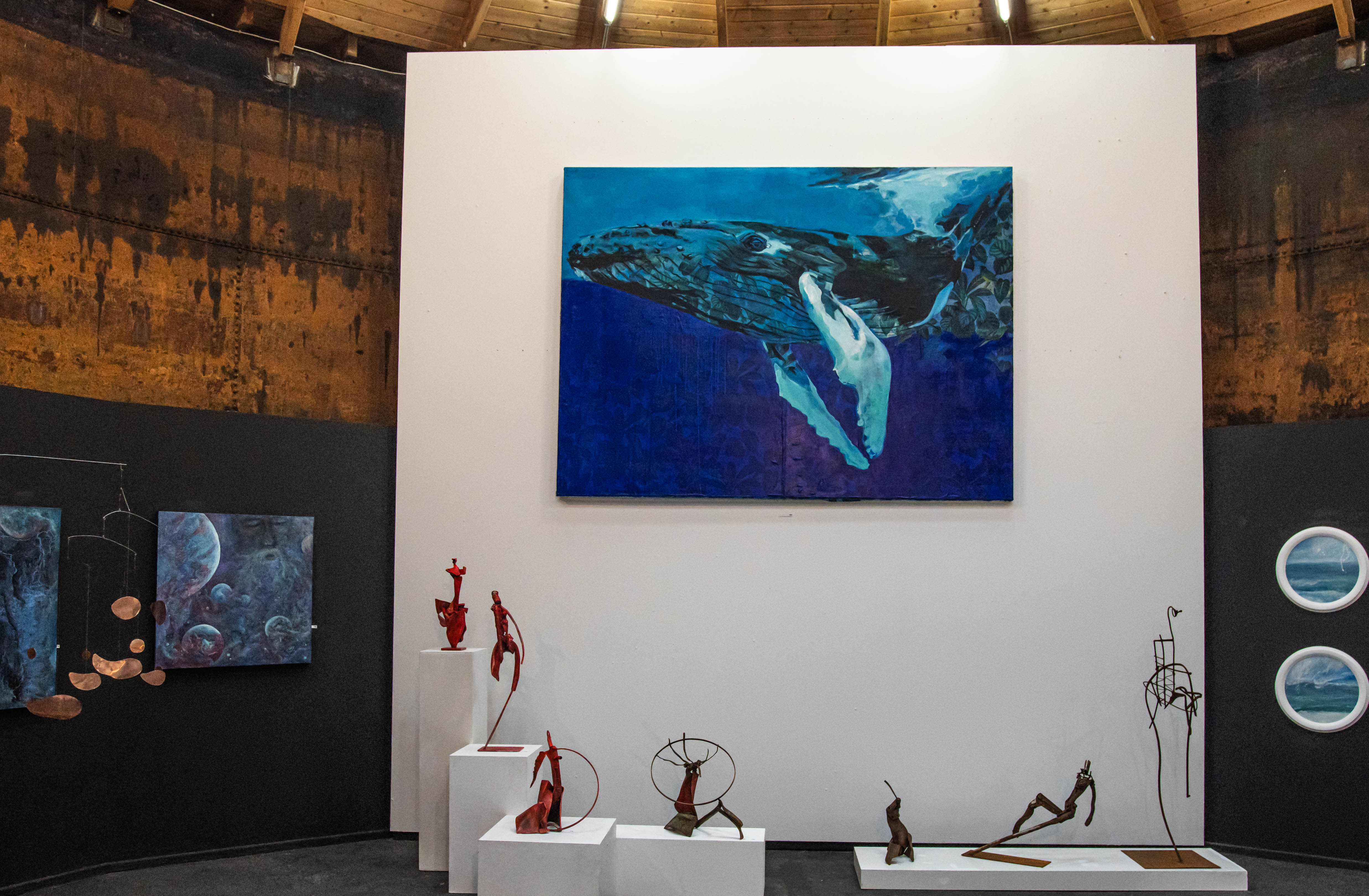 Eine Plane mit der Frau, die mit der Stirnlampe nach Kunst sucht, markiert den Eingang zwischen den Kesseln. Bereits im ersten Tank begegnet man einem gigantischen Wal im blaugefärbten Ozean, gemalt mit Ölpastell und Acryl auf Leinwand. Darunter – quasi auf dem Meeresgrund – lagern skurrile Wesen, rote oder oxidierte Stahlskulpturen, die mit den verrosteten Wänden korrespondieren. Sowohl deren Patina, als auch das Blau des Meeres setzt sich in den links angrenzenden dunklen Gemälden fort.