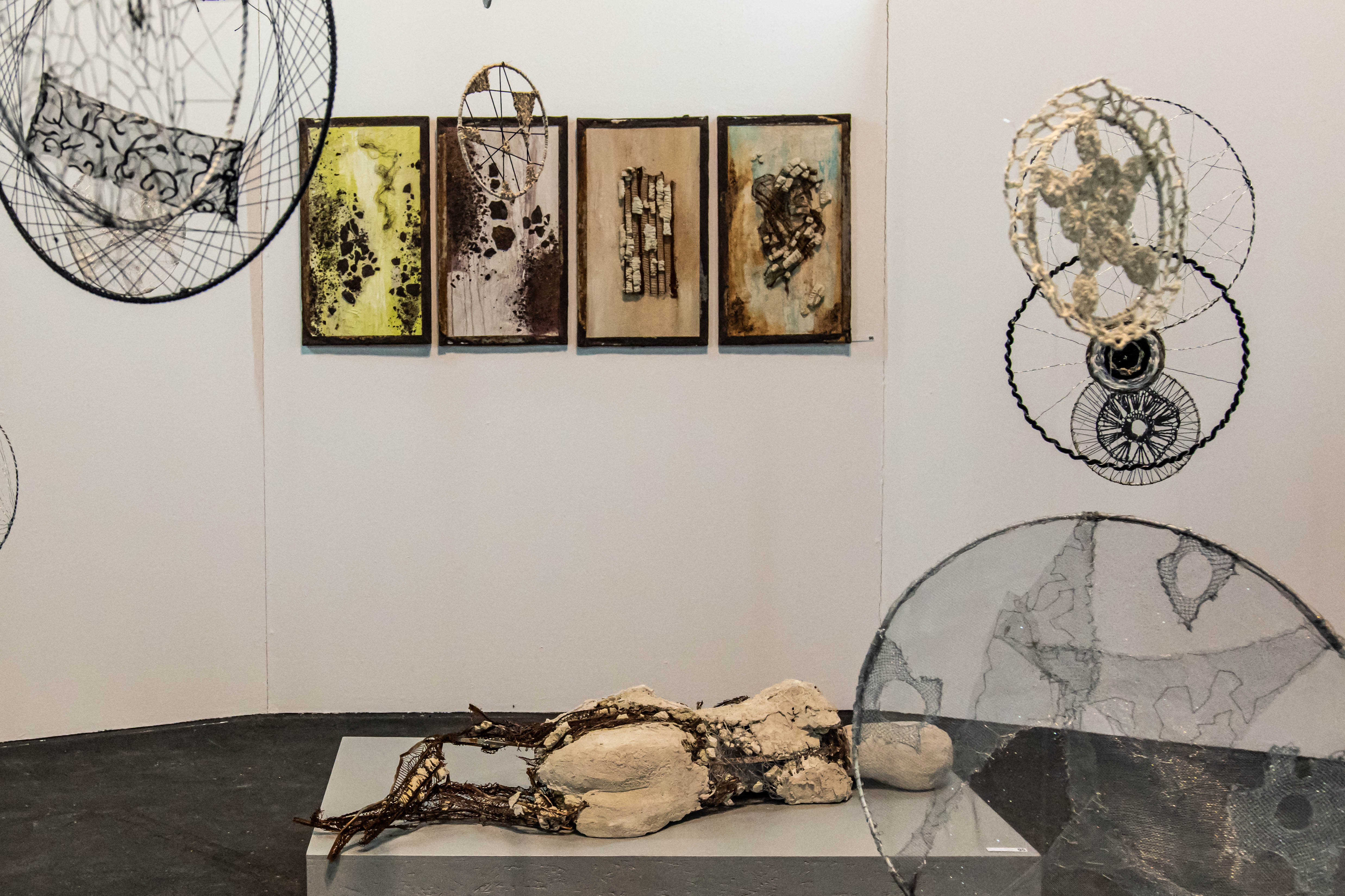 Noch stärker, geradezu als körperlich erfahrbares Eintauchen (Immersion) ist das im zweiten Behälter spürbar: Das Environment wird zum Erlebnisraum jenseits des White Cube. Von der Decke hängen zahlreiche „Himmel / Hirngespinster“, kleine textile und metallische Dinge, die den Blick auf eine sinnliche Serie von sechs großen schwarzweißen Akten oder kühne Objekte aus Bauschutt mit Gips („Mutter und Kind“) beeinflussen.