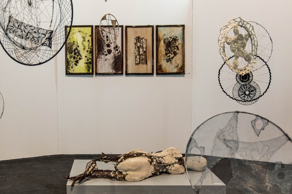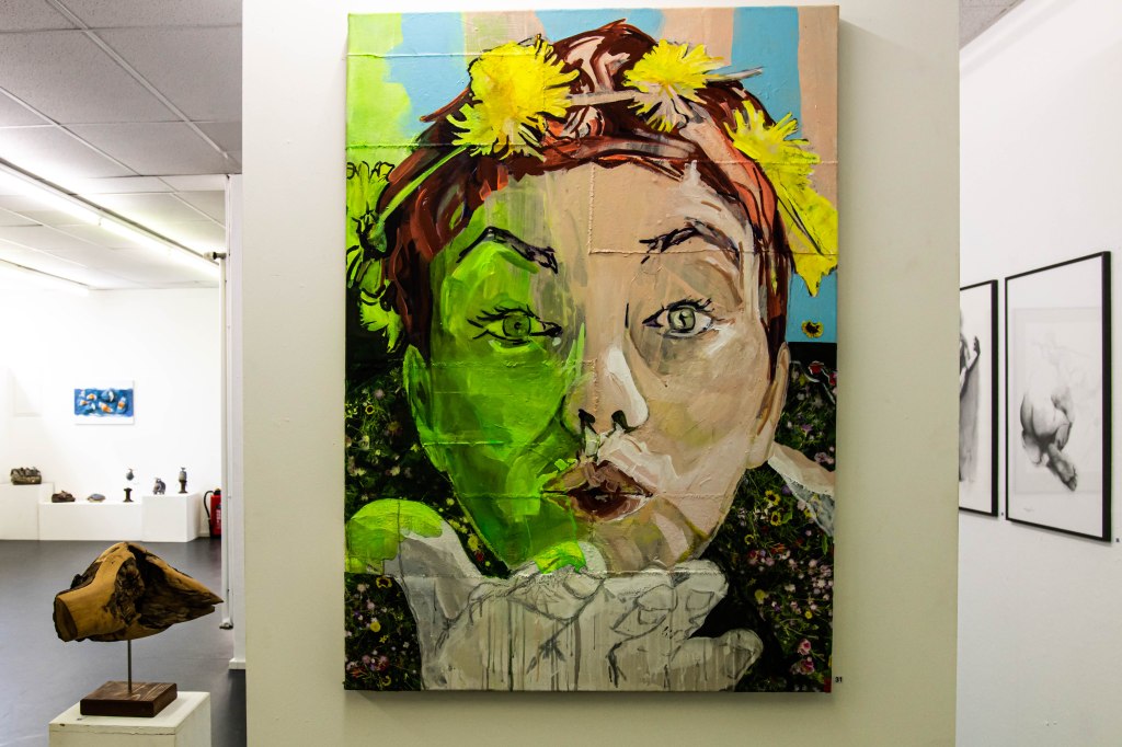 Dann erreicht man die Galerie, wo etliche Malereien und Skulpturen thematisch gruppiert sind. Zu sehen sind „Akte“, „Köpfe“ oder Darstellungen von Menschen. Dazwischen 24 textile Collagen, die wie Steine und Kiesel anmuten, zwei flammenartige Holzgebilde und weitere abstrahierte Plastiken. Das große grüne Gesicht – „Mit Frühlingsgefühlen nach dem Coronawinter“ – blickt uns an. Eine kokett wirkende „Traumtänzerin“ verweist auf das Ende der Ausstellung.