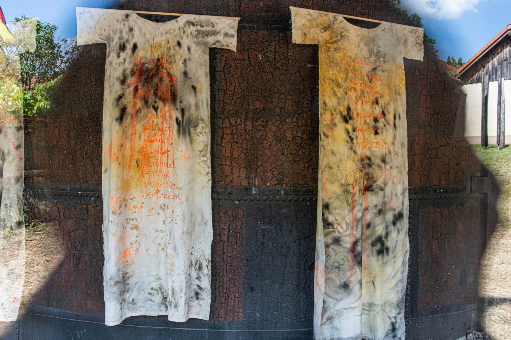 Im gebogenen, lichtdurchfluteten Gang von den Tanks zur Galerie hängen an der rostigen Wand kleiderartige Gebilde mit aufgestickten Empfindungen wie „gelähmt“, „gereinigt“, „verknotet“, „verengt“ – also festgehaltenen Spuren innerer und äußerer Auseinandersetzungen. Farbige Flecken auf den Textilien erinnern an diese Prozesse.