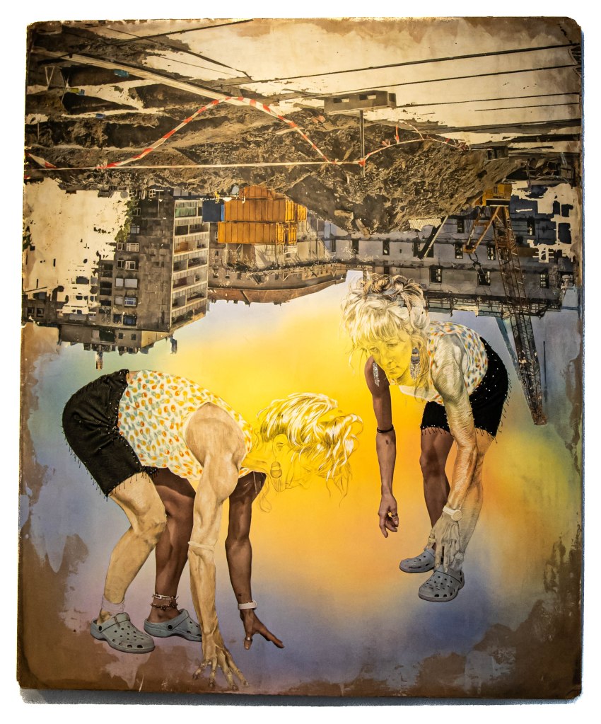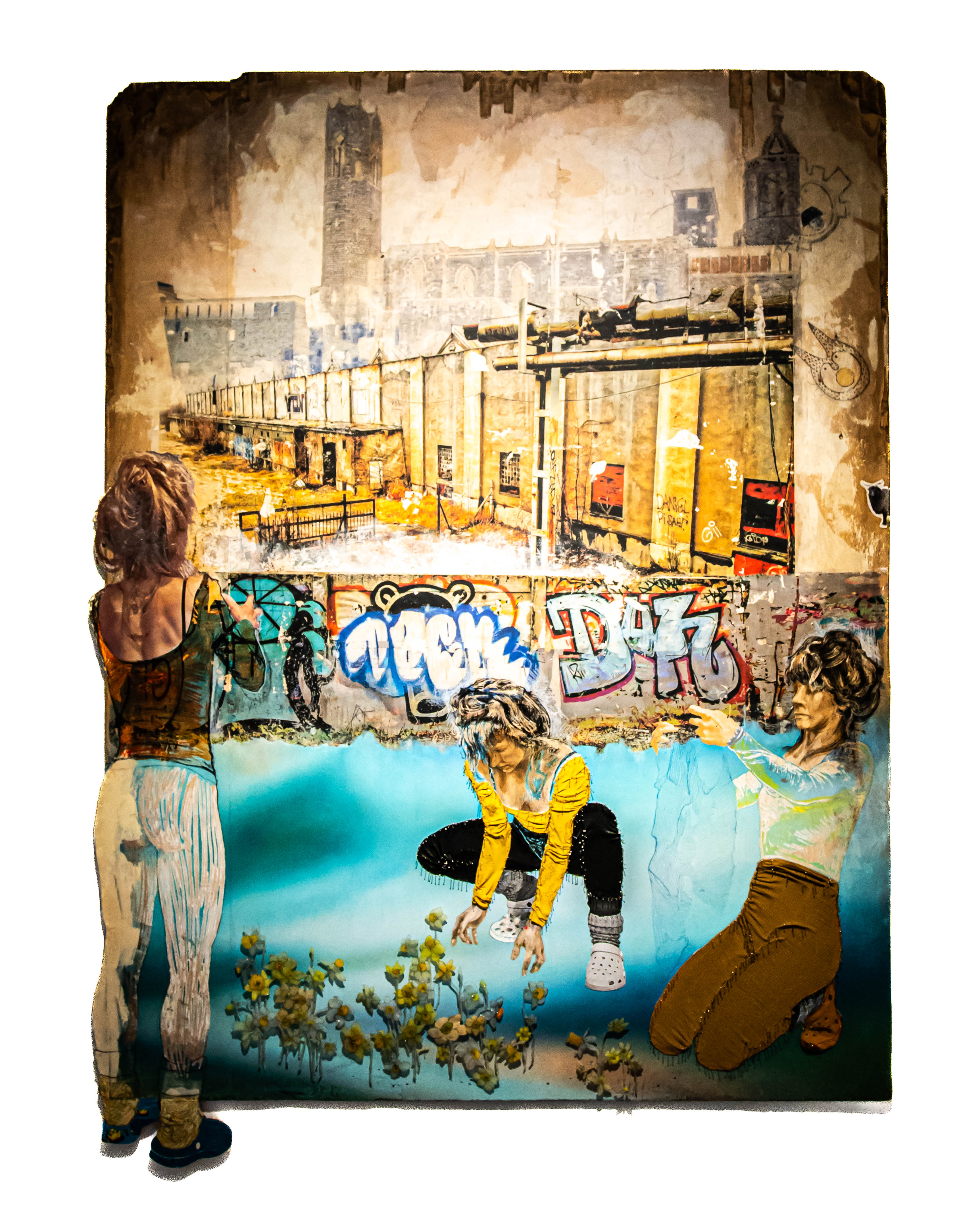 Manchmal steht ihre Welt buchstäblich auf dem Kopf. Dunkle heruntergekommene Industriekomplexe. Graue unwirtliche Stadtlandschaften. Düstere Mauern mit Graffiti. Gegen diese urbane Tristesse setzt die Künstlerin kräftige, unwirkliche Farben – und sich selbst. Denn die häufig auftauchende blonde Frau auf vielen Werken könnte sie selbst sein. Doch die etwa Vierzigjährige kreiert keine narzisstischen Selbstdarstellungen, sondern ihre einsamen oder lebhaften Aktionen vermitteln Bewegung – am Abgrund gegen den Verfall.