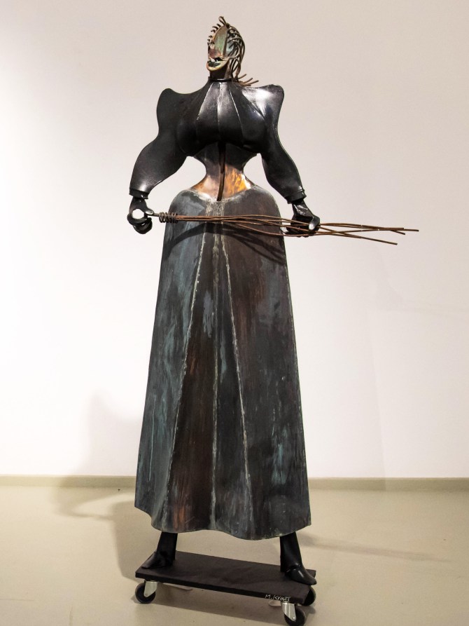 Diese Figur ist jedoch kein Opfer. Breitbeinig, standfest und selbstbewusst steht sie auf einem kleinen Rollwagen und suggeriert Kraft und Eigenständigkeit. Als Auftakt verweist sie auf ein Motiv, das sich in der Ausstellung mehrfach findet: selbstbestimmte, starke feminine Figuren.