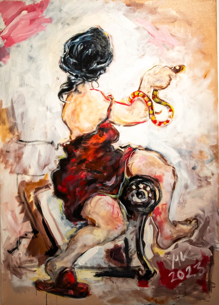 Ein üppig gemaltes Weib hält auf einem Acrylbild eine Schlange fest in der Hand und verweigert offensichtlich den Suizid. „Cleopatra hat sich*s anders überlegt“ heißt der Titel. Inszenierte Fotos unter Acrylglas zeigen einzelne einsame Frauen, die coole riesige Gebäude durchstreifen. Auf grellroten dramatischen Pigmentdrucken, „Me Somewhere Else“, von Mojgan Razzaghi sind die Frauen gar nicht mehr sichtbar. Deren Abwesenheit symbolisiert gesellschaftliche Ausgrenzung und Unterdrückung, welche die Künstlerin in ihren Werken oft thematisiert.