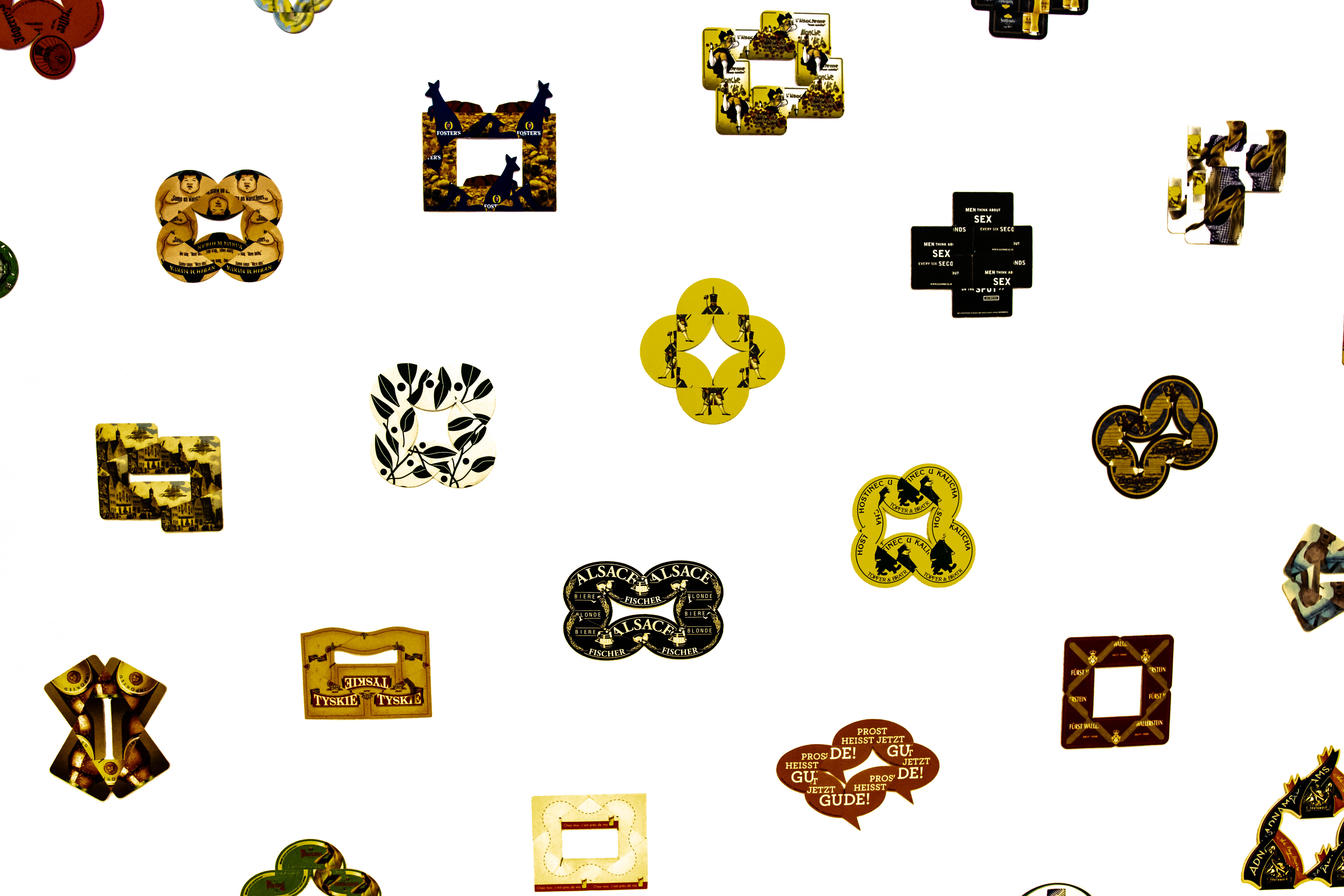 Zunächst erkennt man jedoch kaum Bierdeckel, sondern die vielen Objekte erzeugen insgesamt ein Muster oder Geflecht. Die schiere Menge verschiebt die Wahrnehmung vom einzelnen Gebilde auf das serielle Prinzip. Doch immer wieder schweift der Blick von der Gesamtkomposition ab zu ihren einzelnen Bestandteilen – jeweils einige gleiche Untersetzer wurden durch Schnitte, Anordnungen und Verschiebungen spielerisch neu zusammengesetzt. Mal verfremden sie die erkennbaren Ausgangsbilder, mal verschwindet die ursprüngliche Wirkung. Meist sind die Logos und Motive kaum noch erkennbar.