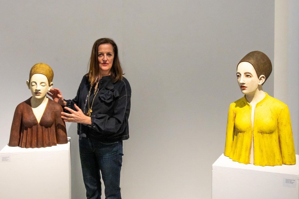Gleich zu Beginn begegnen uns übergroße Köpfe der Bildhauerin auf hohen Sockeln, später auch lebensgroße Frauenbüsten. Alle Gesichter wirken entspannt, mal in sich gekehrt, mal herausfordernd – aber immer ohne dramatischen Ausdruck. Auch viele in der Ausstellung verteilte, vollständig modellierte Figuren sitzen meist recht zurückhaltend auf Sockeln zusammen und ruhen in sich. Sie sind leicht verkleinert modelliert, Körper und Antlitze vermitteln dieselbe Haltung. Manche sind leicht einander zugewandt, andere wirken völlig versunken und scheinen sich selbst zu genügen. Alle halten inne und sind still…