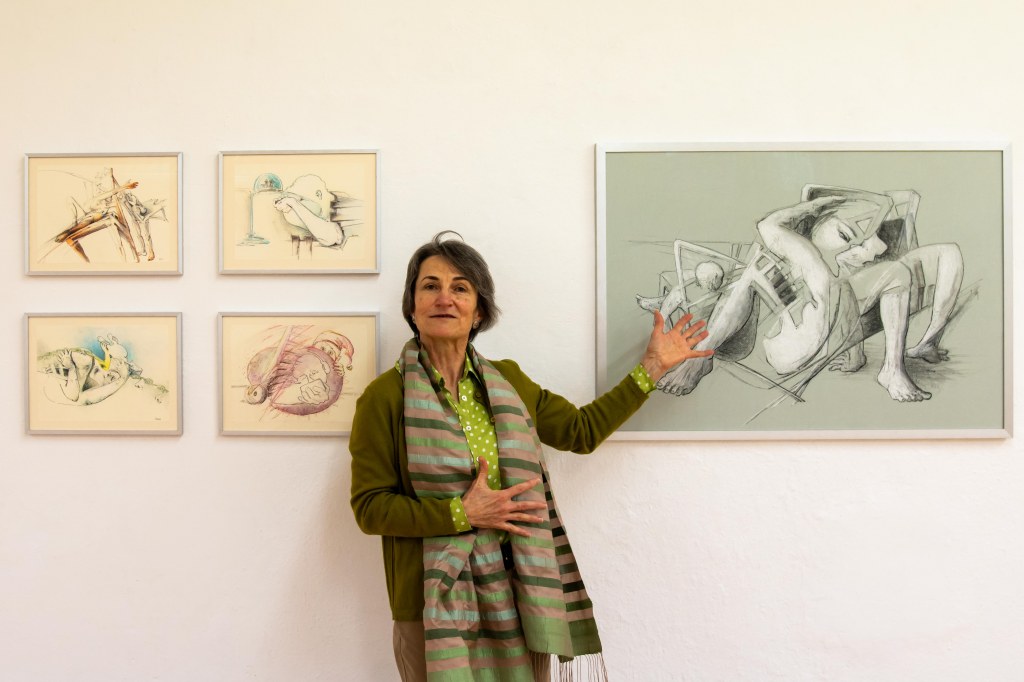 Isolde Nagel vor ihrem Bild „Zwischen Stühlen“ , rechts „Schmetterlingsdefekte“