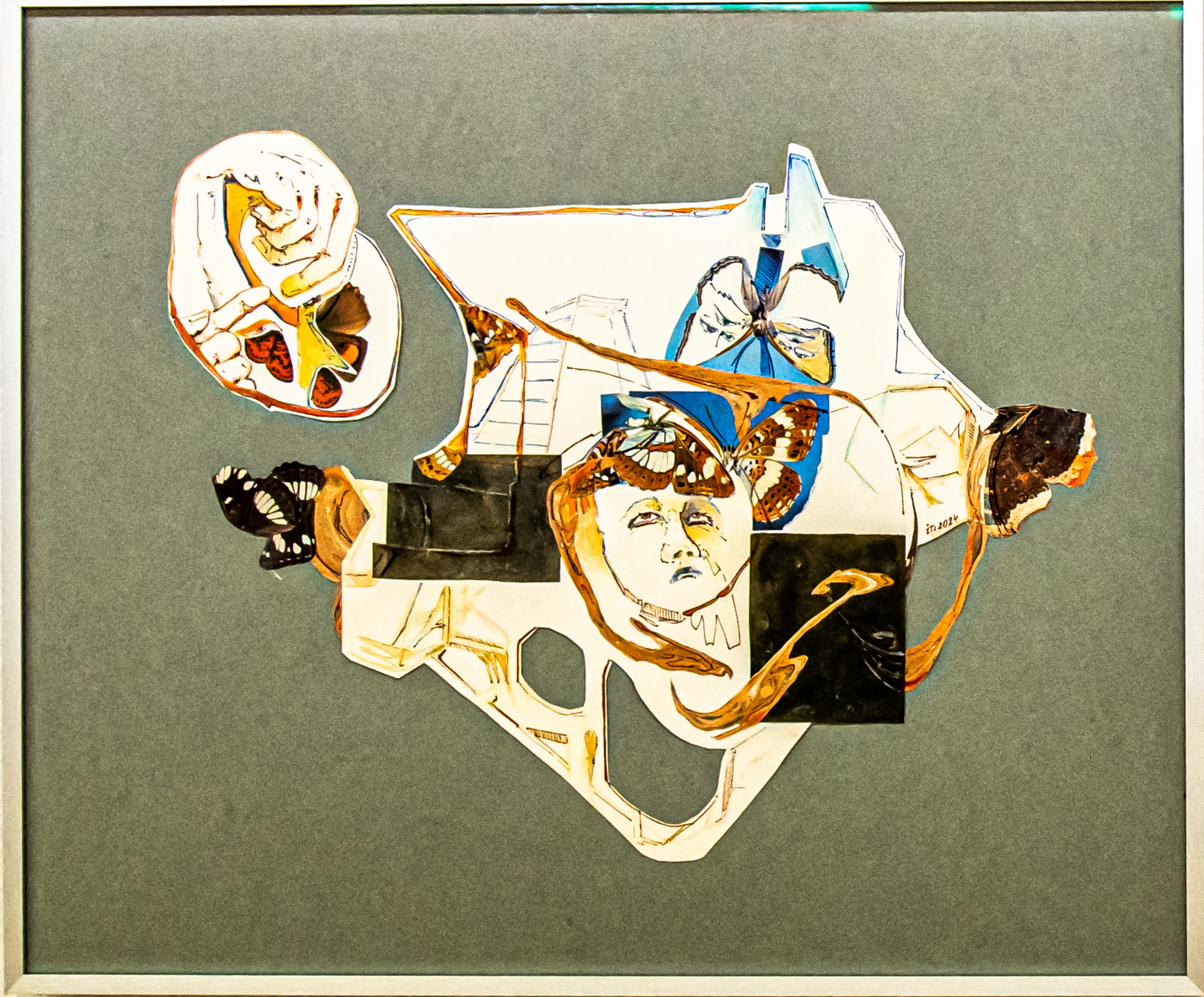 Isolde Nagels zweite Werkgruppe in der Studioausstellung trägt den poetisch verrätselten Titel „Schmetterlingsdefekte“. Die fünf Mixed-Media-Collagen zeigen aufgefaltete Falter, in deren Flügeln sich Köpfe, Tiere, Hände und Zeichnungen, mitunter auch kleine Schmetterlinge überlagern. Tatsächlich erinnern die flachen Formen an die Flatterwesen, doch anstelle klarer symmetrischer Flügel erscheinen hier bebilderte Fragmente wie in surrealistischen Montagen.