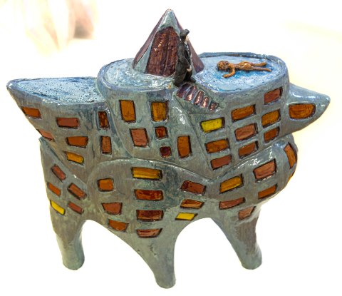 Schnell wird klar, Galeotti ist beileibe kein Töpfer, sondern ein mit Ton arbeitender Poet, der die Garstigkeit unserer sich drehenden Welt (so eine weitere Skulptur) und die Unzulänglichkeit der Menschen ironisch aber nachsichtig anprangert. Sein keramisches Architekturensemble mutet sogar hoffnungsvoll an und setzt einen Kontrapunkt gegen allzu negative Weltsichten. Aus eigenartig schönen, futuristischen Gebäuden treten einzelne, vielleicht einsame Menschen heraus, die sich in die schöne neue Welt trauen. Einer nähert sich wohl behutsam seiner nackten Nachbarin… „Die unvollkommenen Architekturen der Seele“, heißt der etwas verrätselte Titel dieser fantastischen Werkgruppe.