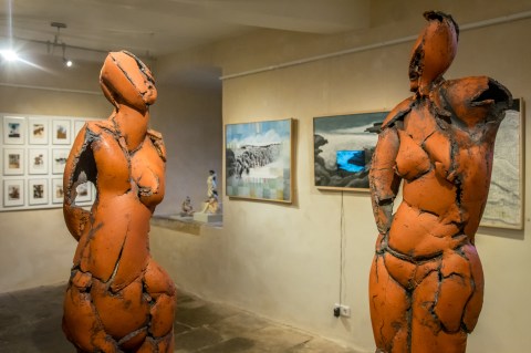 In den Galerieräumen beeindrucken den Besucher gleich auf den ersten Blick die lebensgroßen roten Skulpturen Pufahls. Es sind weiblich wirkende Figuren, die von ihr aus groben, unterschiedlich geformten Keramikplatten zusammengesetzt und schwarz verfugt wurden. Diese Wesen selbst sind erkennbare und doch unbestimmte, zerbrechliche und zugleich kraftvolle Grenzgängerinnen – sie vereinigen in sich diese Gegensätze. Zu ihnen gesellt sich eine reduzierte, gerade noch menschlich wirkende grau-weiße Gestalt. Sie sieht wie ein aus Steinen geschichtetes Objekt aus, das zu zwei Bildern Bachs hinter ihr zu gehören scheint. Darauf sind von ihm getürmte graue Findlinge mit menschlichen Zügen dargestellt, welche er mit „Die Schöne und das Tier“ betitelt (Foto unten).