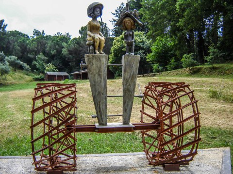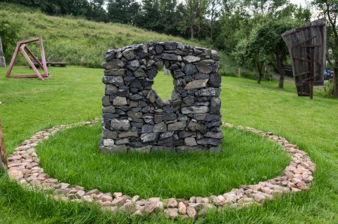 Stundenlang kann (und soll) man in der Landschaft von einem Kunstwerk zum nächsten wandern, sich zwischendurch aber auch an schattigen Plätzen ausruhen. Der Parcours beginnt bei Spoerris Brunnen und Skulpturen aus Fleischwölfen, dann trifft man auf eine gewaltige Gänseherde aus Beton oder kann eine Aussichtsplattform besteigen. Gemeinsam mit einer lebensgroßen Bronzeskulptur sieht man von dort oben den „Labyrinthischen Mauerweg“.