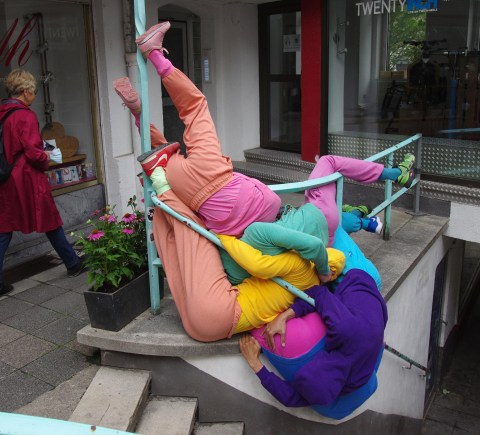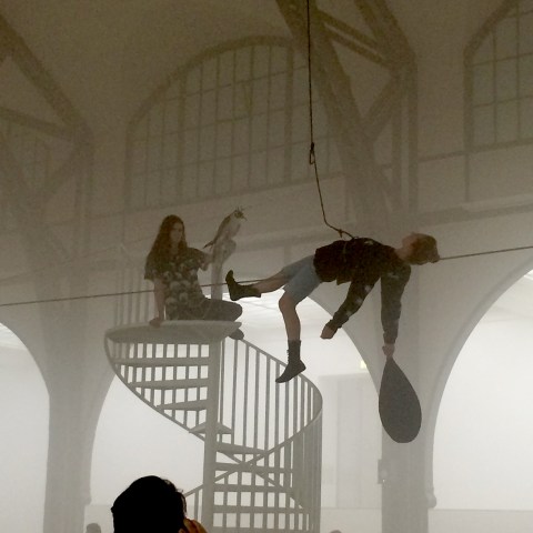 Während sich die leer geräumte, riesige Wartehalle des ehemaligen Bahnhofs mit Nebel füllt, fläzen sich betont cool und lässig eine Menge junger Leute auf großen Podesten links und rechts der Treppe zum Saal. Decken, Schlafsäcke, verstreute Klamotten und Essensreste suggerieren, hier wird Tag und Nacht für die Kunst gelebt. Seltsame Klänge und Geräusche füllen den dunstigen Raum. Mutige Zuschauer verschwinden bereits im Nebelschleier, nach und nach kommen auch Akteure dazu.