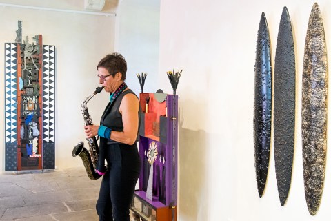 „Ich leiste aktive Wiedergeburtshilfe“, sagt die Modedesignerin und Grafikerin Roswitha Berger-Gentsch, die sich mit ihren Arbeiten nun ganz der freien Kunst widmet. Aus Kartons mit geringer Lebensdauer großer Discounter fertigt sie durch Schnitte, eingewebte Strukturen und Mosaike sehr eigenartige Collagen. Noch überraschender sind ihre großen Vasen, Füllhörner und freien Artefakte aus teilweise farbiger Wellpappe. Monika Ebertowski, die Leiterin der Station, kannte die Werke bisher nur von Fotos und gestand in der Vernissage, „völlig verzaubert“ zu sein.